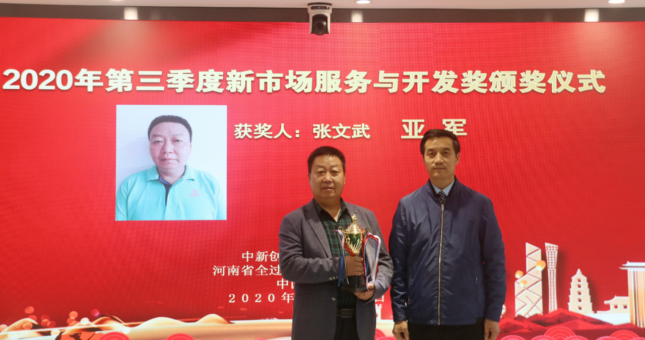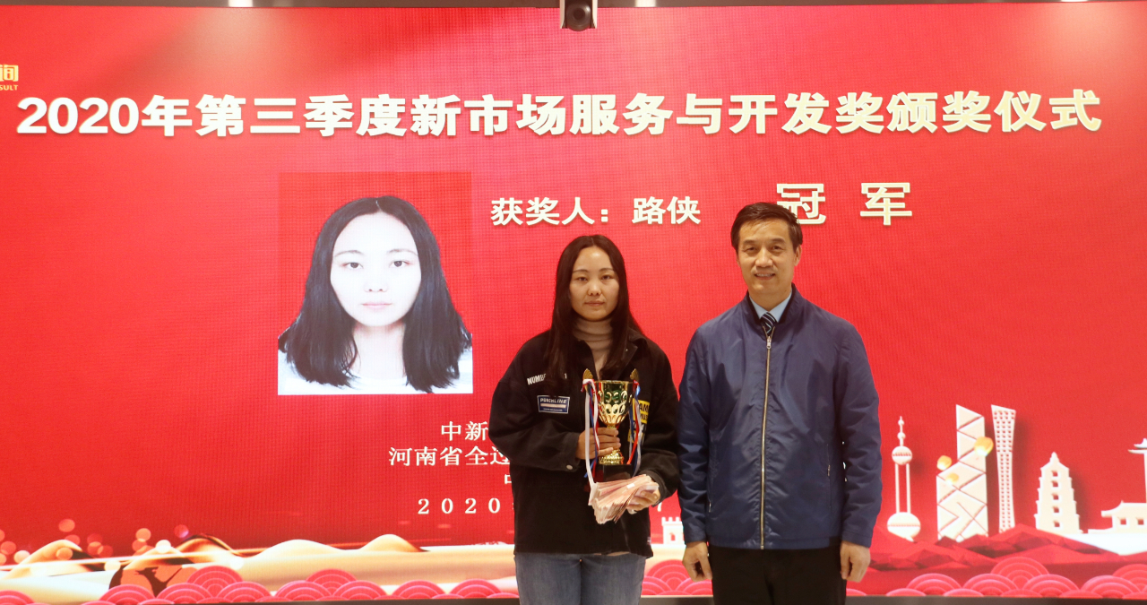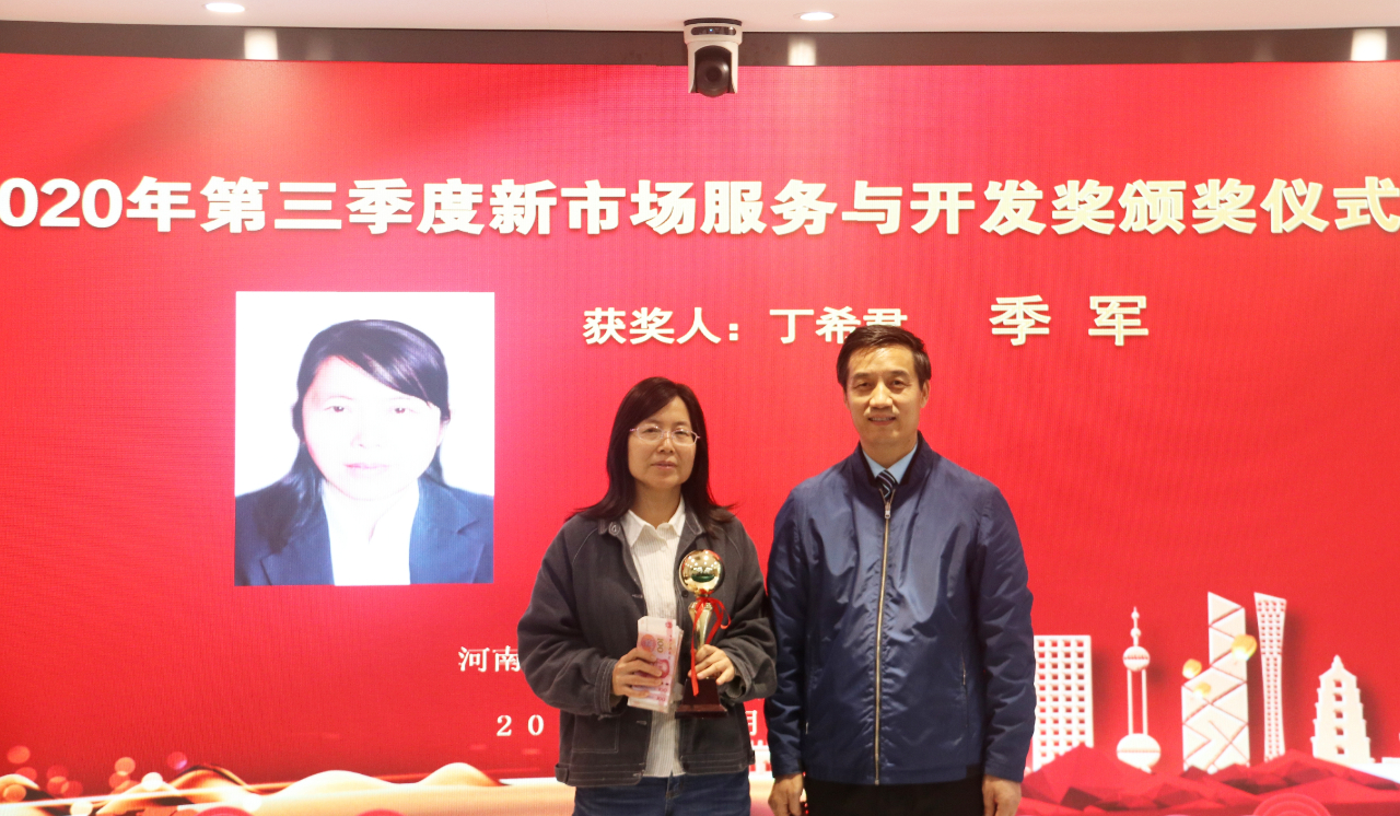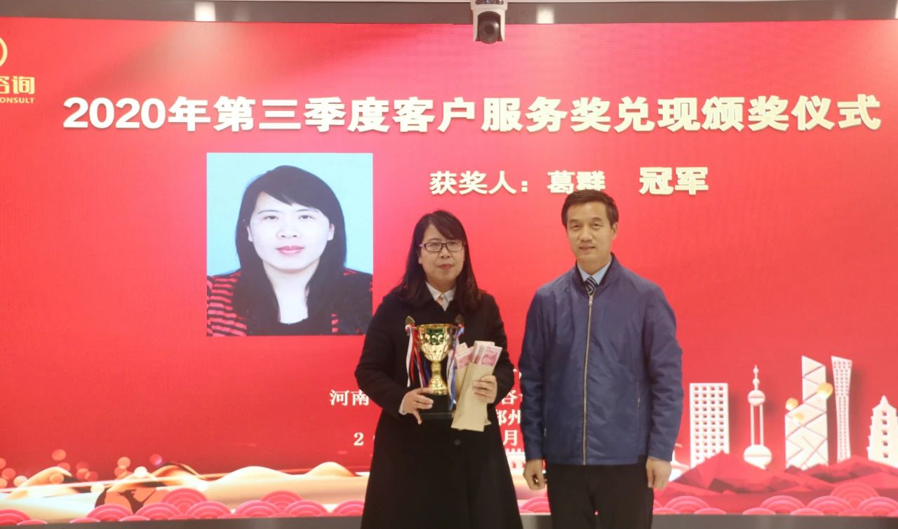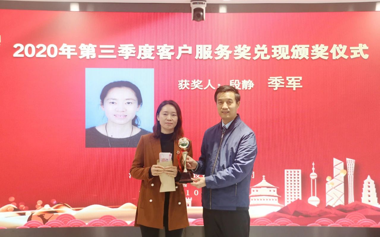 董事長楊明宇為在2020年第三季度客戶服務工作中表現突出的先進個人頒發獎杯和獎金。